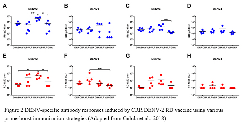 Figure 2 DENV-specific antibody responses induced by CRR DENV-2 RD vaccine using various prime-boost immunization strategies (Adopted from Galula et al., 2018) |