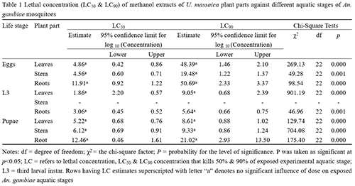 Table 1 Lethal concentration (LC50 & LC90) of methanol extracts of U. massaica plant parts against different aquatic stages of An. gambiae mosquitoes Notes: df = degree of freedom; χ2 = the chi-square factor; P = probability for the level of significance. P was taken as significant at p<0.05; LC = refers to lethal concentration, LC50 & LC90 concentration that kills 50% & 90% of exposed experimental aquatic stage; L3 = third larval instar. Rows having LC estimates superscripted with letter “a” denotes no significant influence of dose on exposed An. gambiae aquatic stages |