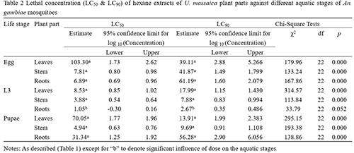 Table 2 Lethal concentration (LC50 & LC90) of hexane extracts of U. massaica plant parts against different aquatic stages of An. gambiae mosquitoes Notes: As described (Table 1) except for “b” to denote significant influence of dose on the aquatic stages |