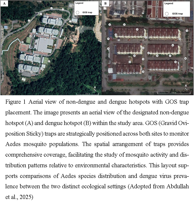 Figure 1 Aerial view of non-dengue and dengue hotspots with GOS trap placement. The image presents an aerial view of the designated non-dengue hotspot (A) and dengue hotspot (B) within the study area. GOS (Gravid Oviposition Sticky) traps are strategically positioned across both sites to monitor Aedes mosquito populations. The spatial arrangement of traps provides comprehensive coverage, facilitating the study of mosquito activity and distribution patterns relative to environmental characteristics. This layout supports comparisons of Aedes species distribution and dengue virus prevalence between the two distinct ecological settings (Adopted from Abdullah et al., 2025)
