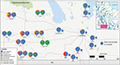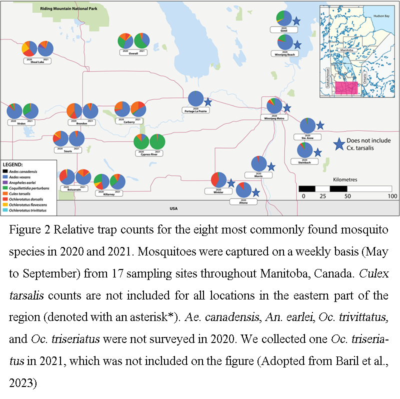 Figure 2 Relative trap counts for the eight most commonly found mosquito species in 2020 and 2021. Mosquitoes were captured on a weekly basis (May to September) from 17 sampling sites throughout Manitoba, Canada. Culex tarsalis counts are not included for all locations in the eastern part of the region (denoted with an asterisk*). Ae. canadensis, An. earlei, Oc. trivittatus, and Oc. triseriatus were not surveyed in 2020. We collected one Oc. triseriatus in 2021, which was not included on the figure (Adopted from Baril et al., 2023)