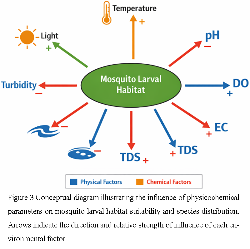 Figure 3 Conceptual diagram illustrating the influence of physicochemical parameters on mosquito larval habitat suitability and species distribution. Arrows indicate the direction and relative strength of influence of each environmental factor