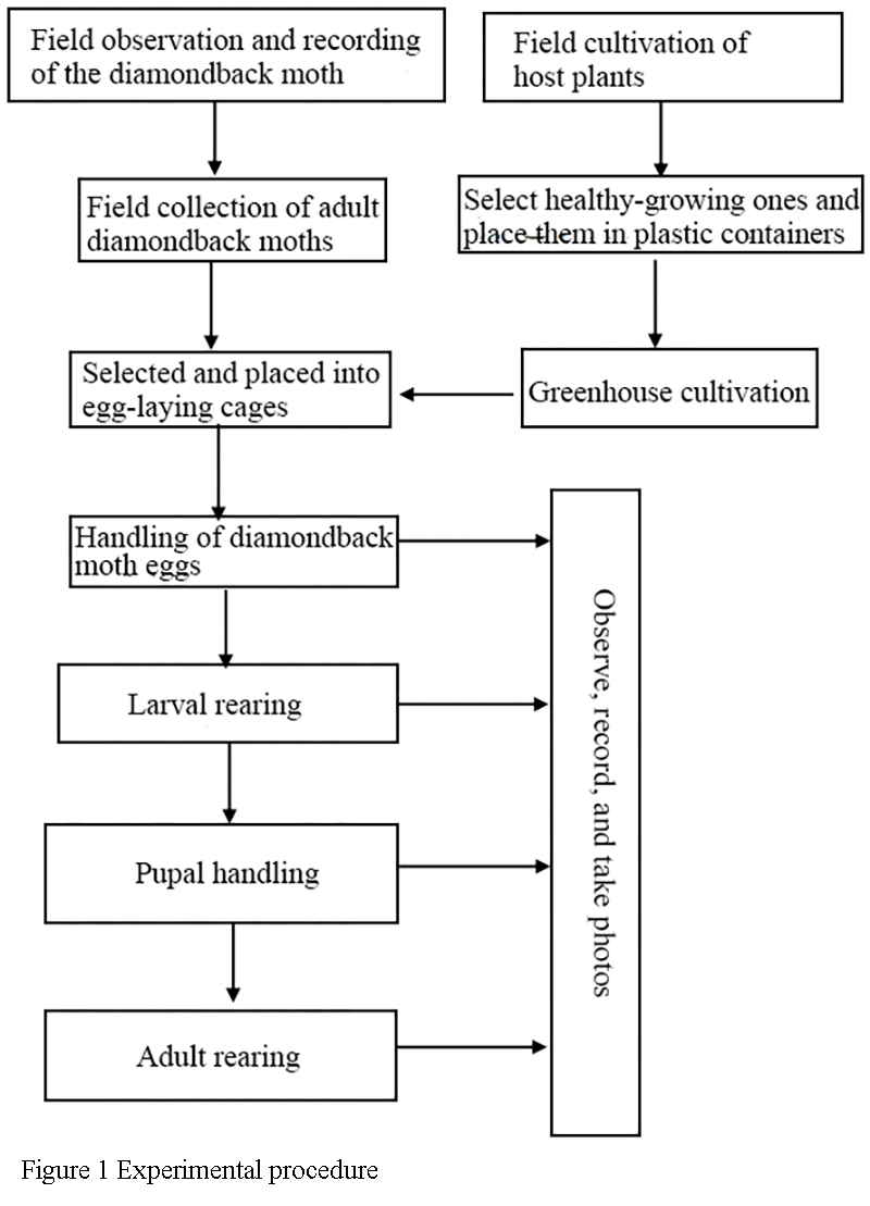 This experiment was done indoors under controlled conditions. Adult moths were collected from the field, and Chinese cabbage was used as the food plant. The goal was to observe the full life cycle of the diamondback moth. The experiment included five main steps: (1) Collecting adult moths from the field and separating males and females to start the first generation; (2) Growing Chinese cabbage at the same time to use as the host plant; (3) Setting up a controlled environment with fixed temperature, humidity, and light cycle; (4) Rearing and watching the moth through all life stages-egg, larva, pupa, and adult; (5) Recording how long each stage took, how the insects behaved, and how their numbers changed (Figure 1). This setup was based on recent lab methods for rearing diamondback moths. It helps provide a steady insect supply and creates clear, repeatable data (Xing et al., 2014).