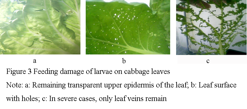 Figure 3 Feeding damage of larvae on cabbage leaves Note: a: Remaining transparent upper epidermis of the leaf; b: Leaf surface with holes; c: In severe cases, only leaf veins remain |
