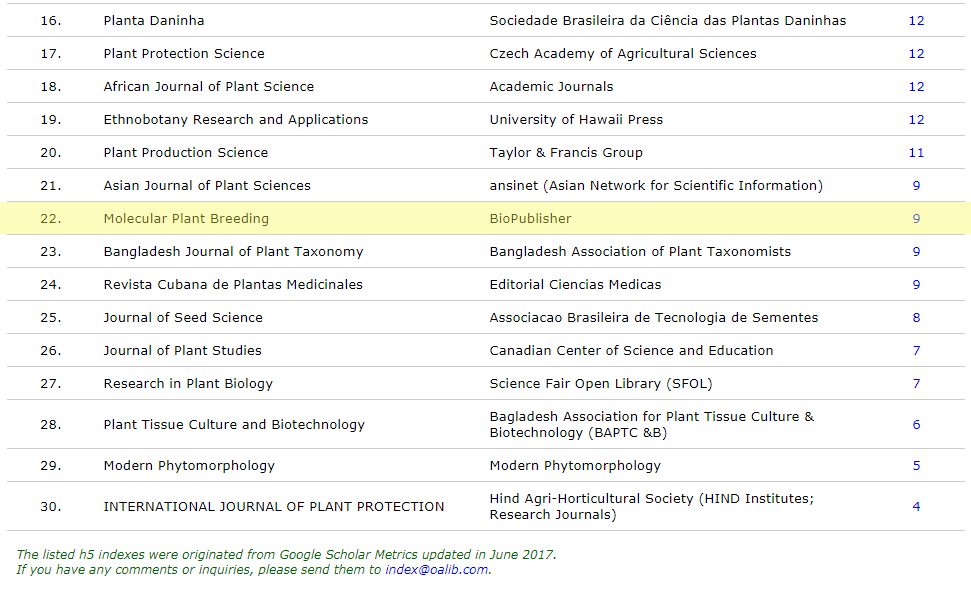 Congratulations! The h5-index for the journal Molecular Plant Breeding published by BioPublisher is 9, ranked 22nd in the top open access journals matching Plant Science.