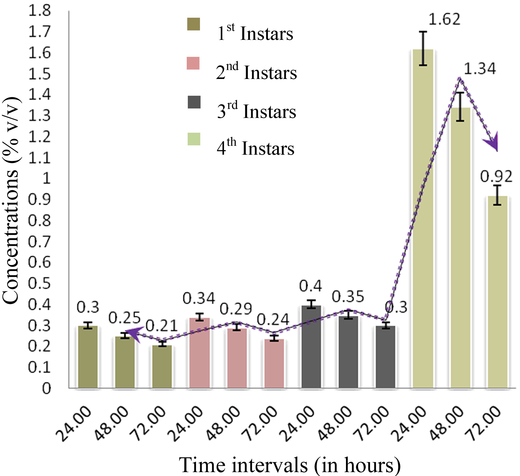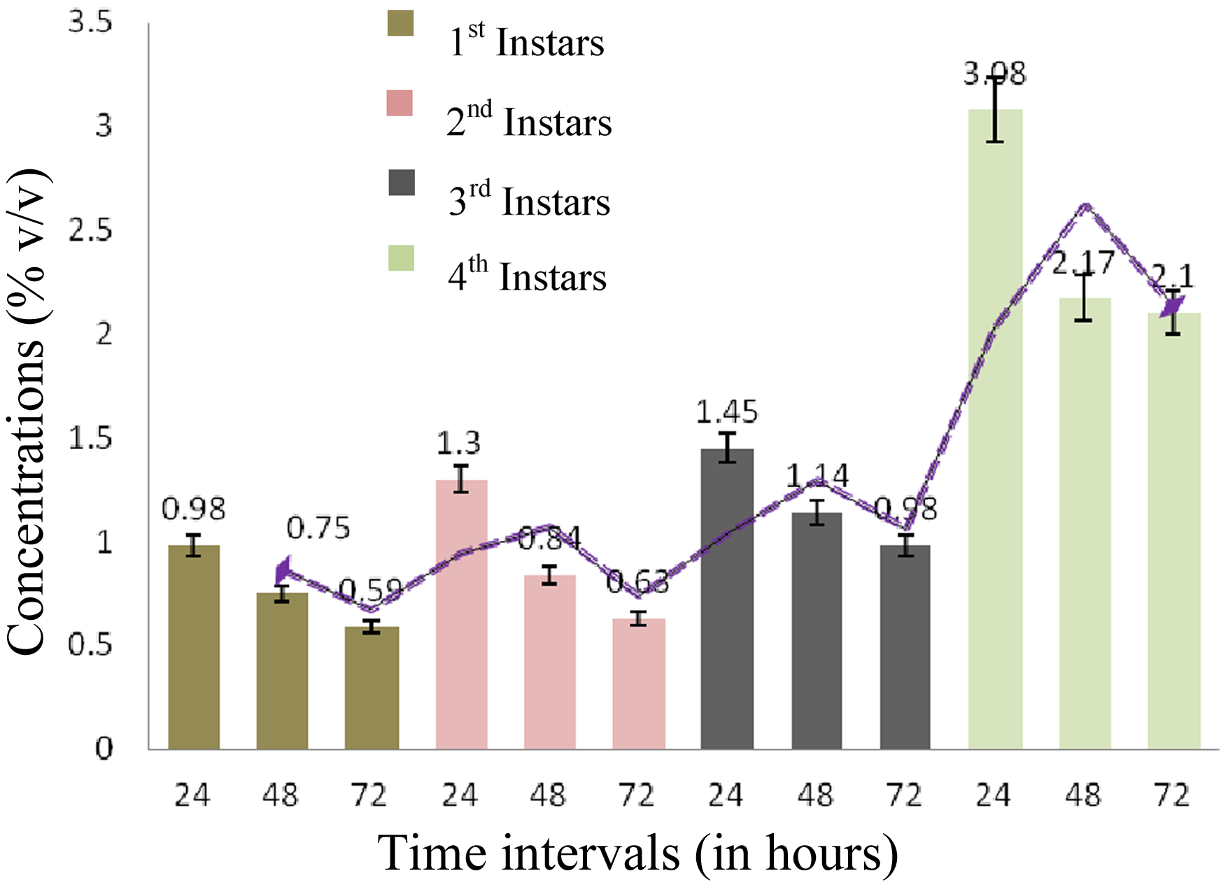 Table 5 Completely randomized three way ANNOVA analysis using concentration (C), hour (H) and instars (I) as three parameters |