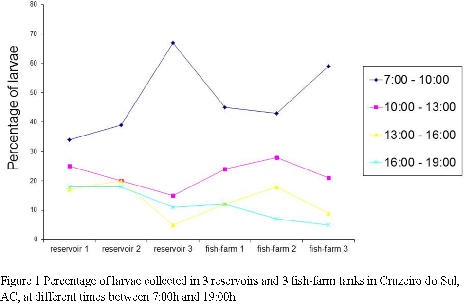 ![]() Figure 1 Percentage of larvae collected in 3 reservoirs and 3 fish-farm tanks in Cruzeiro do Sul, AC, at different times between 7:00h and 19:00h |