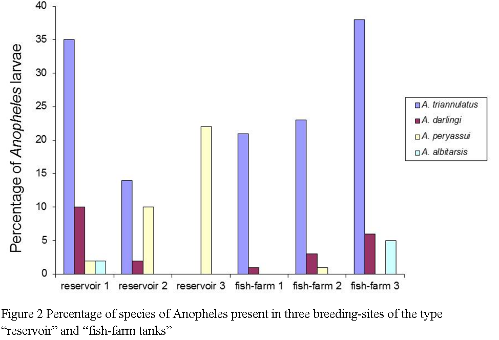 ![]() Figure 2 Percentage of species of Anopheles present in three breeding-sites of the type “reservoir” and “fish-farm tanks” |