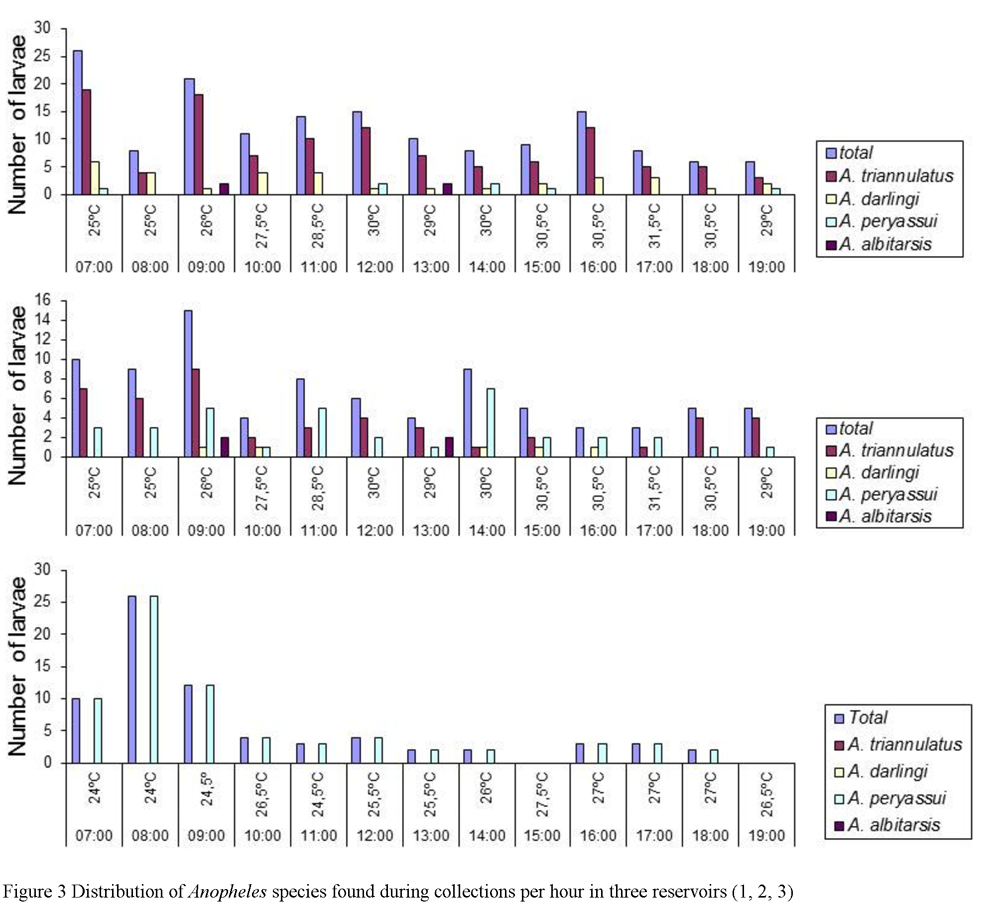 ![]() Figure 3 Distribution of Anopheles species found during collections per hour in three reservoirs (1, 2, 3) |