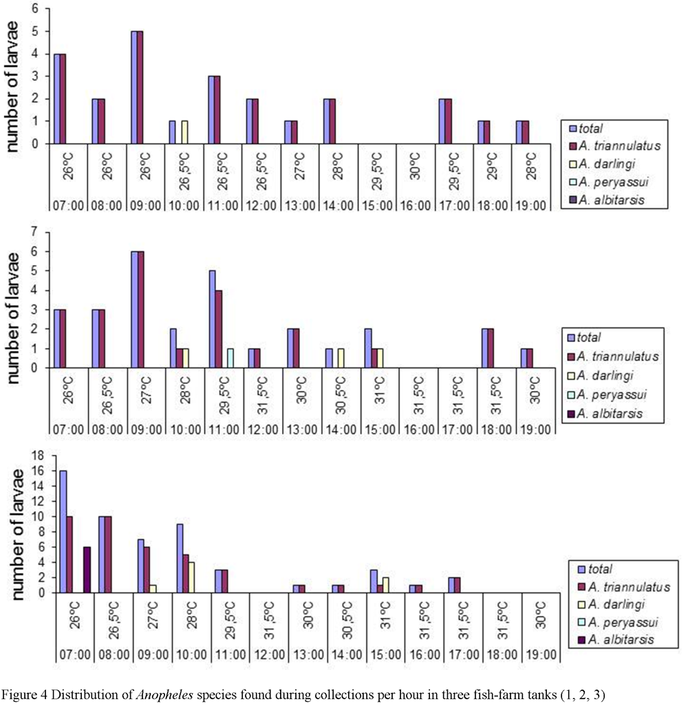 ![]() Figure 4 Distribution of Anopheles species found during collections per hour in three fish-farm tanks (1, 2, 3) |
