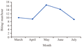 The landing density of mosquitoes varied from month to month likely influenced by climatic factors and human habits. Maximum biting density (16.5 mph) was found in May and lowest (9.1 mph) biting density was found in the July. In contrast, Gowda and Viayan (1993) observed a maximum biting density of Cx. quinquefaciatus in March (12.3 mph) and minimum in July (4.9 mph) in India.  These differences may be explained by the fact that we observed seven species where their study was consisting of only single species Cx. quinquefaciatus. It has been observed that biting density was higher in hot and rainy months (e.g., May) and climatic conditions (warmer temperatures and high humidity) may allow mosquitoes to live longer and parasite to develop faster (Noden et al., 1995).
