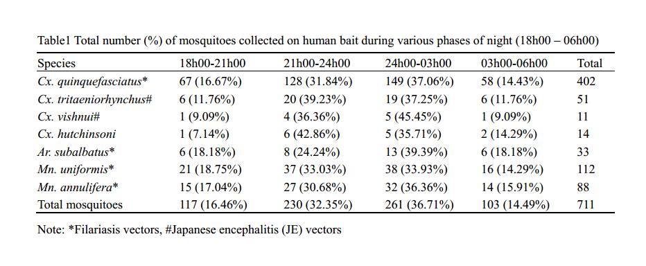 Table1 Total number (%) of mosquitoes collected on human bait during various phases of night (18h00-06h00)
