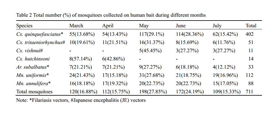 Table 2 Total number (%) of mosquitoes collected on human bait during different months
