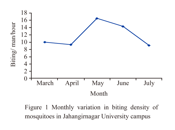 Figure 1 Monthly variation in biting density of mosquitoes in Jahangirnagar University campus