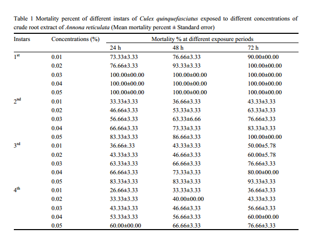 ![]() Table 1 Mortality percent of different instars of Culex quinquefasciatus exposed to different concentrations of crude root extract of Annona reticulata (Mean mortality percent ± Standard error) |