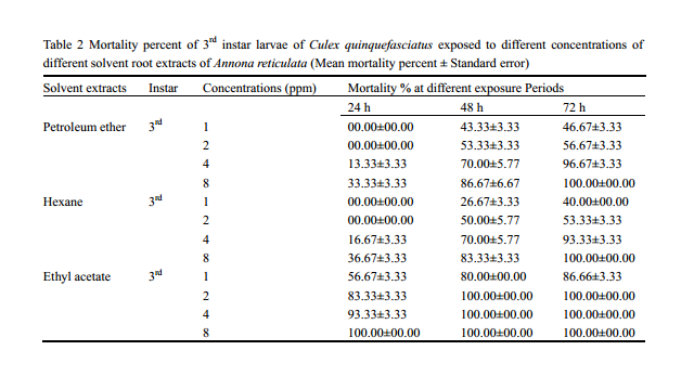 ![]() Table 2 Mortality percent of 3rd instar larvae of Culex quinquefasciatus exposed to different concentrations of different solvent root extracts of Annona reticulata (Mean mortality percent ± Standard error) |