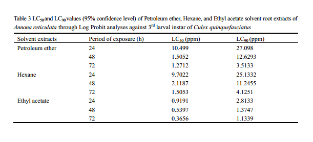![]() Table 3 LC50 and LC90 values (95% confidence level) of Petroleum ether, Hexane, and Ethyl acetate solvent root extracts of Annona reticulata through Log Probit analyses against 3rd larval instar of Culex quinquefasciatus |