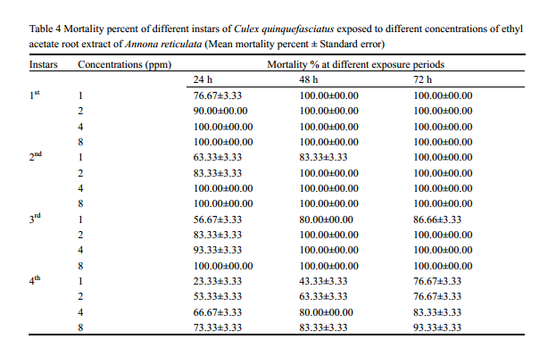 ![]() Table 4 Mortality percent of different instars of Culex quinquefasciatus exposed to different concentrations of ethyl acetate root extract of Annona reticulata (Mean mortality percent ± Standard error) |
