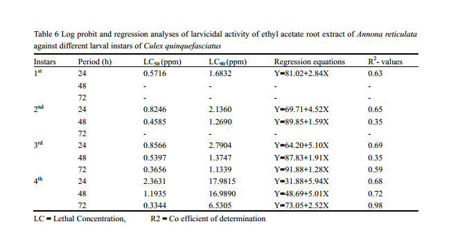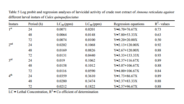 ![]() Table 5 Log probit and regression analyses of larvicidal activity of crude root extract of Annona reticulata against different larval instars of Culex quinquefasciatus LC = Lethal Concentration, R2 = Co efficient of determination |