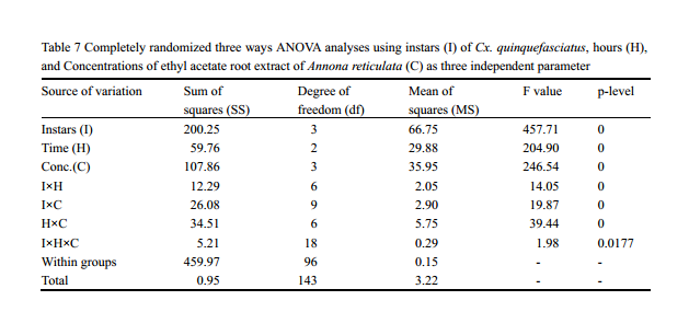 ![]() Table 7 Completely randomized three ways ANOVA analyses using instars (I) of Cx. quinquefasciatus, hours (H), and Concentrations of ethyl acetate root extract of Annona reticulata (C) as three independent parameter |