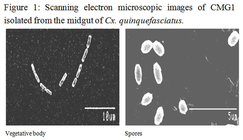 , 2002). This bacterial species was 2000-fold more abundant in mosquitoes that were blood fed as compared to those which were not. The present isolated mid gut bacteria CMG1 was found to be sensitive against different antibiotics and plant extracts. Neem and Citronella extracts both showed higher sensitivity against CMG1. Whereas