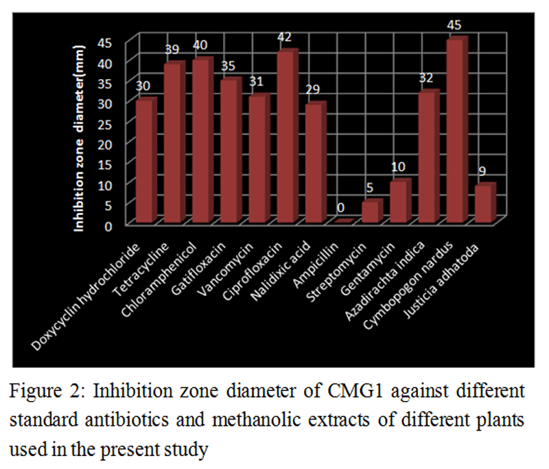 The isolate was sensitive against standard doses (μg/disc) of Doxycyclin hydrochloride, Tetracycline, Chloramphenicol, Gatifloxacin, Vancomycin, Ciprofloxacin and Nalidixic acid, but resistant to Ampicillin, Streptomycin and Gentamycin antibiotics. The isolate CMG1 showed sensitivity to the methanolic extract of neem [