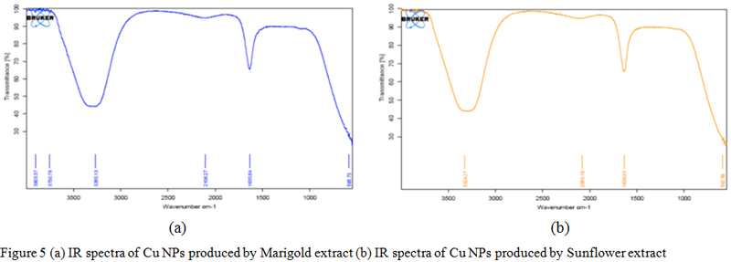 Figure 5 (a) IR spectra of Cu NPs produced by Marigold extract (b) IR spectra of Cu NPs produced by Sunflower extract |