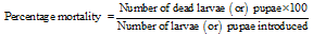 Twenty larvae (fourth instars) was placed in 249 mL of de-chlorinated water in a 500 mL glass beaker, and CuNPs was added in different beakers according to the dose. Tests of each concentration (1, 5 and 10 ppm) against each instar were replicated thrice. In each case, the control comprised 20 larvae in 250 mLof distilled water (Arjunan et al. 2012). Control mortality was corrected by using Abbott’s formula (Abbott 1925), and percentage mortality was calculated as follows:
