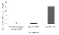 The number of mosquitoes collected in a trap with worn sock alone was statistically higher than those in a trap attached to Risasi Electric mosquito mat slowly releasing prallethrin (F=256.25, df=1, P>0.001) (Figure 2). Position of the trap did not influence the differences on mosquito collection (F=0.434, P=0.511).