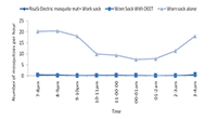 Comparison of three treatments; a trap with a worn sock alone, another with DEET sprayed on worn sock and other with worn sock attached to Risasi electric mosquito mat slowly releasing prallethrin found have a significant variation in mosquito sampling with a trap attached with Risasi electric mosquito mat had least number of mosquito per right (F=353.78, df=2, P>0.001) (Figure 3). The position of any trap had no influence on the number of mosquitoes sampled per right (F=0.319, DF=2, P=0.727). The mean number of mosquitoes sampled hourly was lowest in mosquito electric mat than the rest (Figure 4).