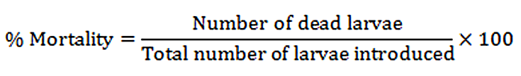 Larvae mortality rate were registered after 48 hours and mortality calculated for each concentration using the formula;