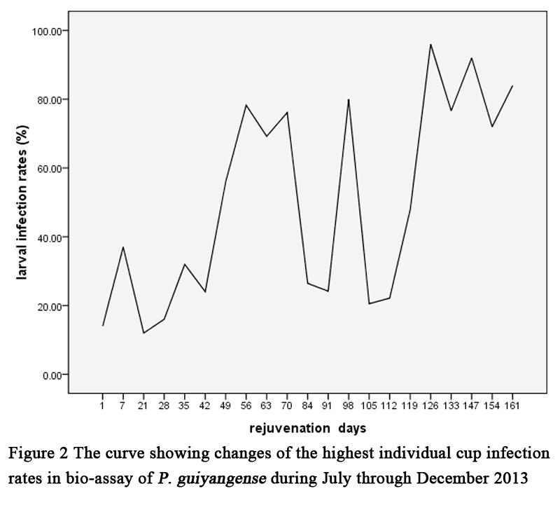 Figure 2 The curve showing changes of the highest individual cup infection rates in bio-assay of P. guiyangense during July through December 2013 |