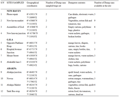 From the five zones in the municipal of Enugu, twenty refuse dumpsters were selected. Table 1 shows the selected dumpsites, frequently encountered content of the dump sites and the number of tin for refuse disposals.