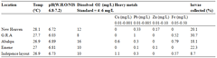 Water samples were analysed for the following physico-chemical parameters: Dissolved Oxygen (DO), pH, Temperature, Copper, Lead, Zinc, and Iron.