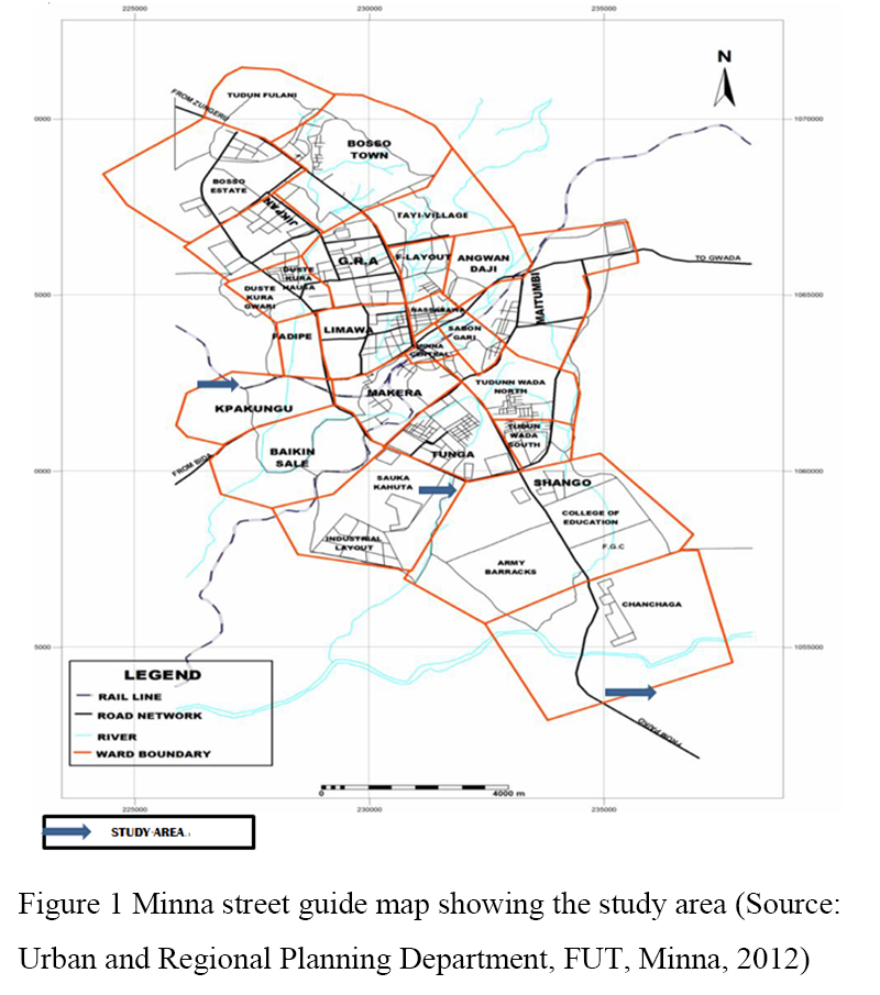 Figure 1 Minna street guide map showing the study area (Source: Urban and Regional Planning Department, FUT, Minna, 2012) |