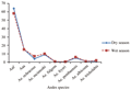Figure 7 ECSA genotype of Chikungunya virus in Aedes species sampled along the coastline of Kenya during dry and wet seasons. Highest infections of the virus in Aedes mosquitoes were during the wet season. The proportions of this genotype in Aedes species along the coastline of Kenya did not vary significantly with the seasons (M=7.25, SD=15), t3=0.325, p>0.001 |