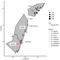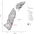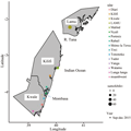 Figure 8 Distribution of the East Central and Southern Africa (ECSA) genotype of Chikungunya virus in Aedes species along the coastline of Kenya during dry season. The ECSA genotype of Chikungunya virus was the only genotype identified in the Aedes species and it was mainly distributed on the northern parts of the coastline of Kenya |