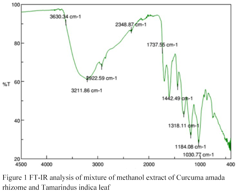 ![]() Figure 1 FT-IR analysis of mixture of methanol extract of Curcuma amada rhizome and Tamarindus indica leaf |