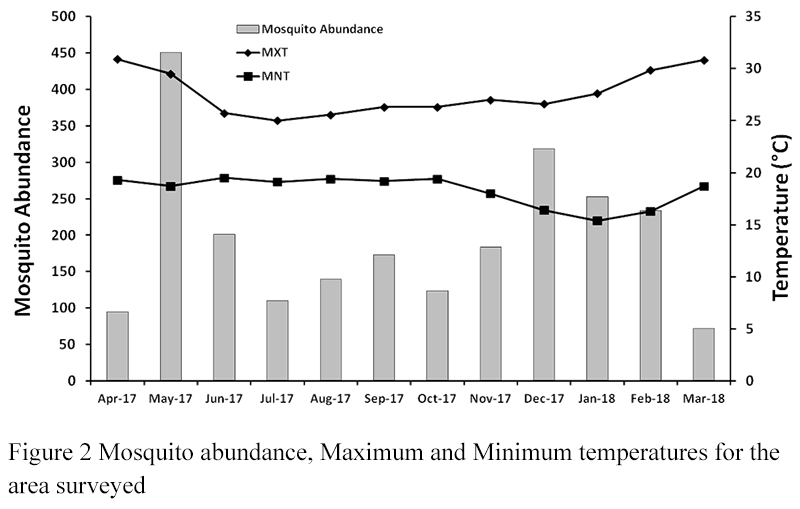 Figure 2 Mosquito abundance, Maximum and Minimum temperatures for the area surveyed |