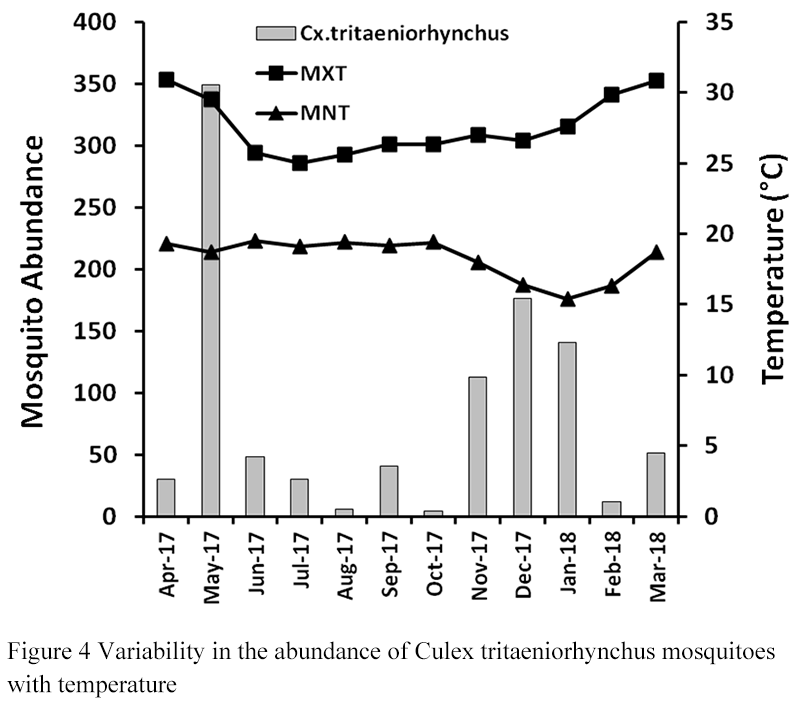 Figure 4 shows the variation of Cx. tritaeniorhynchus abundance with maximum and minimum temperatures (MXT and MNT). The temperature range is favorable for propagation and survival of Cx. tritaeniorhynchus through-out the year. The Pearson's correlation coefficient for Cx. tritaeniorhynchus abundance vs MXT was found to be: r=0.1862 (95% confidence, p-value=0.562) and that for Cx. tritaeniorynchus abundance vs MNT was found to be r=-0.296 (95% confidence, p-value=0.350). This implies that Cx. tritaeniorhynchus mosquito abundance showed very weak positive association with maximum temperature and a weak negative association with minimum temperature during the study period.