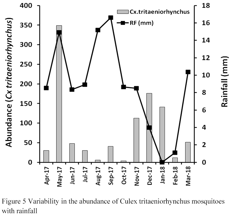 The study also revealed that Culex mosquitoes were most abundant in the area. Culex mosquitoes accounted for 78.4% of the total population. Cx. tritaeniorhynchus was the most abundant species probably because of humid tropical settings and abundant breeding habitat (closeness to paddy fields). The abundance of Cx. tritaeniorhynchus was maximum in the pre-monsoon season. During SW monsoon (JJAS), the rainfall was steady and moderate and Cx. tritaeniorhynchus abundance was least. However, Cx. tritaeniorhynchus abundance increased daring DJF due to less rainfall. Similarly, the abundance of Cx. gelidus was maximum in December. Two distinct peaks were observed once in May-June and the other in November-December-January. During the high rainfall months JJAS, the abundance was very low.