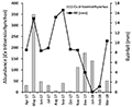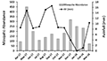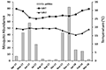 Figure 6 shows the variation of Cx. gelidus abundance with maximum and minimum temperatures (MXT and MNT). The temperature range is favorable for propagation and survival of Cx. gelidus through-out the year. The Pearson's correlation coefficient for Cx. gelidus abundance vs MXT was found to be: r=-0.236 (95% confidence, p-value=0.460) and that for Cx. gelidus abundance vs MNT was found to be r=-0.294 (95% confidence, p-value=0.354). This implies that Cx. gelidus abundance showed very weak positive association with maximum temperature and a weak negative association with minimum temperature during the study period.