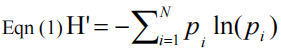 Where pi=ni/N; pi=proportion of total sample represented by ith species and ni is the number of samples of the ith species.