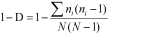 Simpson's Index of Diversity (1-D), reflects the probability that two individuals taken at random from the dataset are not the same species (i.e., will belong to different species). It is defined as: