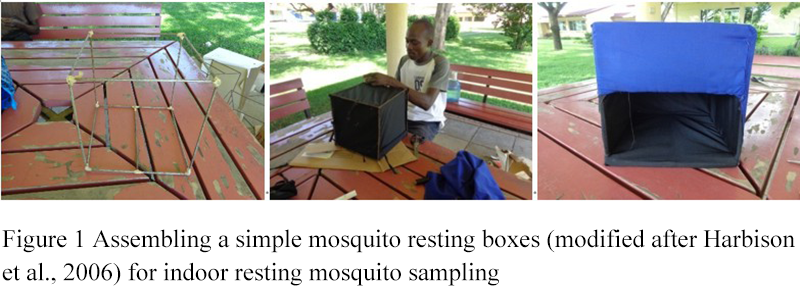 Simple resting boxes for the capture and sampling mosquitoes were made using galvanized wire frame measuring 30 cm × 30 cm × 30 cm and designed in a similar way as one described by Crans (1989). Bright blue and black pieces of cloth were sewn out and inside respectively and square pieces of cartons placed between them for reinforcement (Figure 1).