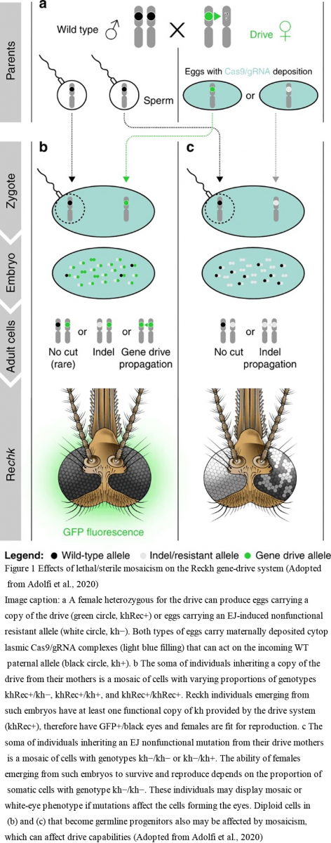 Figure 1 Effects of lethal/sterile mosaicism on the Reckh gene-drive system (Adopted from Adolfi et al., 2020)