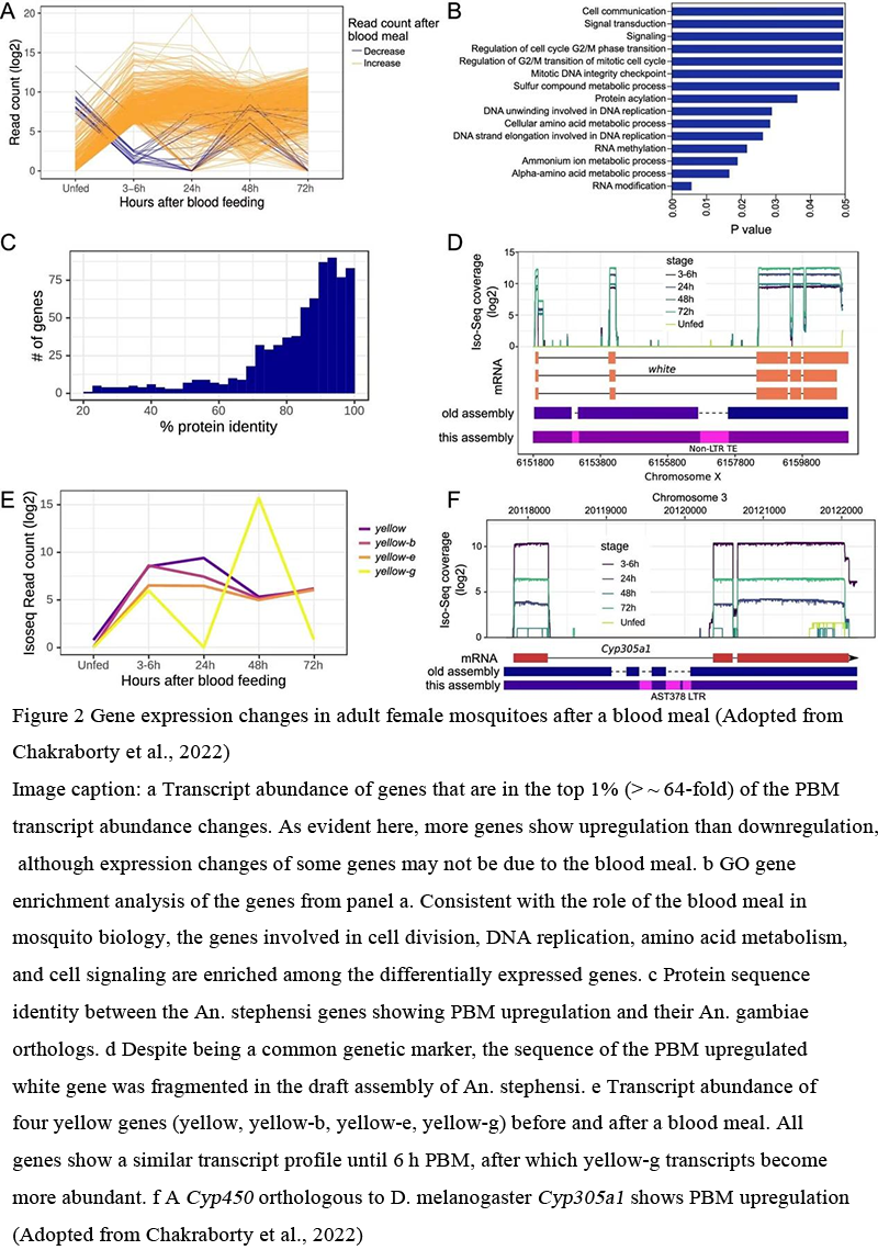 Figure 2 Gene expression changes in adult female mosquitoes after a blood meal (Adopted from Chakraborty et al., 2022)