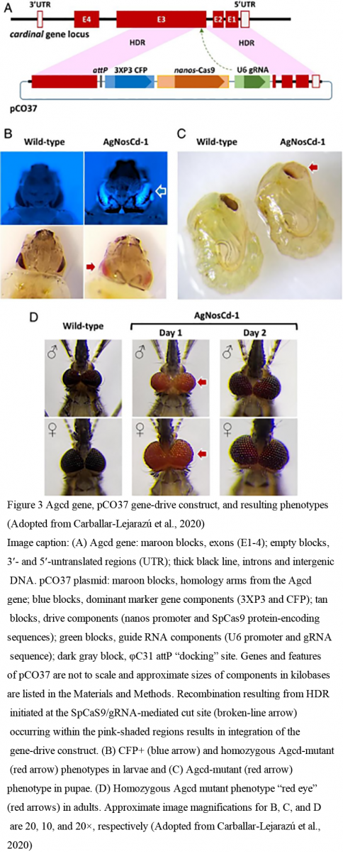 Figure 3 Agcd gene, pCO37 gene-drive construct, and resulting phenotypes (Adopted from Carballar-Lejarazú et al., 2020)