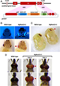 Image caption: (A) Agcd gene: maroon blocks, exons (E1-4); empty blocks, 3′- and 5′-untranslated regions (UTR); thick black line, introns and intergenic DNA. pCO37 plasmid: maroon blocks, homology arms from the Agcd gene; blue blocks, dominant marker gene components (3XP3 and CFP); tan blocks, drive components (nanos promoter and SpCas9 protein-encoding sequences); green blocks, guide RNA components (U6 promoter and gRNA sequence); dark gray block, φC31 attP “docking” site. Genes and features of pCO37 are not to scale and approximate sizes of components in kilobases are listed in the Materials and Methods. Recombination resulting from HDR initiated at the SpCaS9/gRNA-mediated cut site (broken-line arrow) occurring within the pink-shaded regions results in integration of the gene-drive construct. (B) CFP+ (blue arrow) and homozygous Agcd-mutant (red arrow) phenotypes in larvae and (C) Agcd-mutant (red arrow) phenotype in pupae. (D) Homozygous Agcd mutant phenotype “red eye” (red arrows) in adults. Approximate image magnifications for B, C, and D are 20, 10, and 20×, respectively (Adopted from Carballar-Lejarazú et al., 2020)