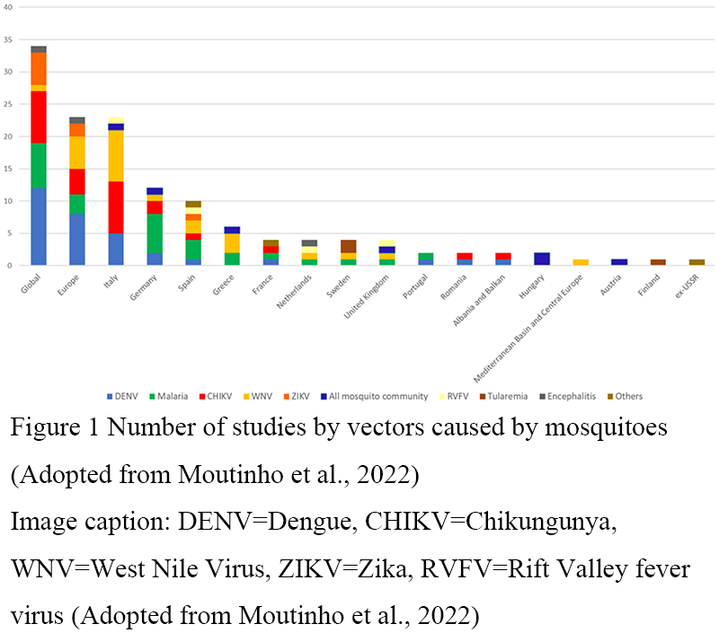 Figure 1 Number of studies by vectors caused by mosquitoes (Adopted from Moutinho et al., 2022) Image caption: DENV=Dengue, CHIKV=Chikungunya, WNV=West Nile Virus, ZIKV=Zika, RVFV=Rift Valley fever virus (Adopted from Moutinho et al., 2022) |
